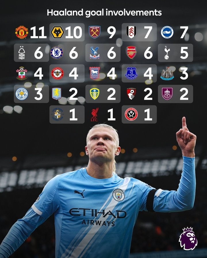 - 专打红魔!哈兰德对曼联已直接加入 11球,比其他任何英超对手都多