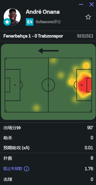 在全场评分中,虽然球队输球,但奥纳纳以8.4分获评全场最高分。