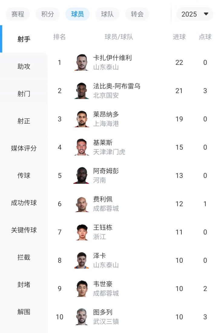 榜首的泰山外援卡扎伊什维利本轮赛事 未赛,同时0个十二码球。