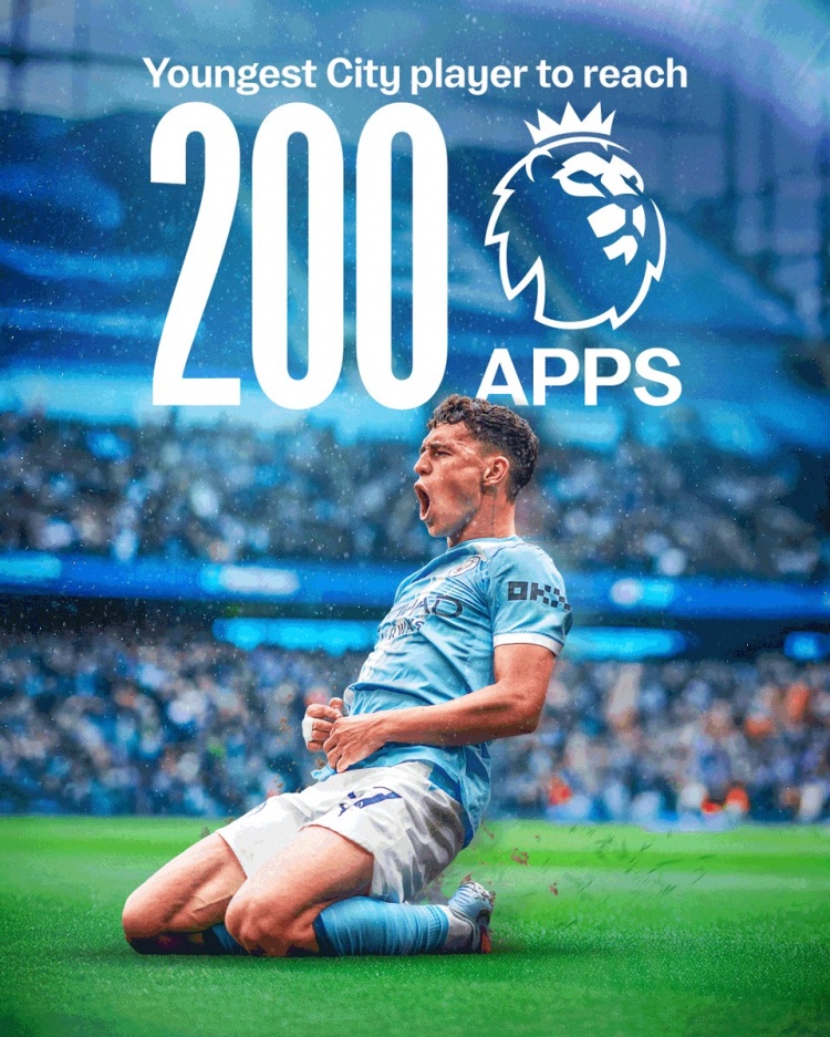 福登将以25岁158天的年纪跨越 斯特林(26岁284天),成为历史上为曼城出战200场英超赛事 最年轻的球员。