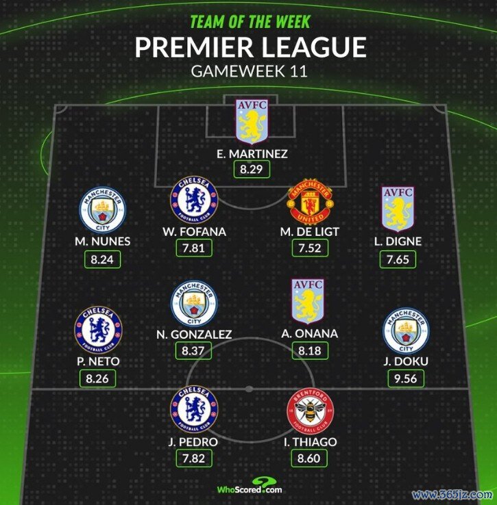 后场球员:努内斯(曼城)、福法纳(切尔西)、德里赫特(曼联)、迪涅(维拉)